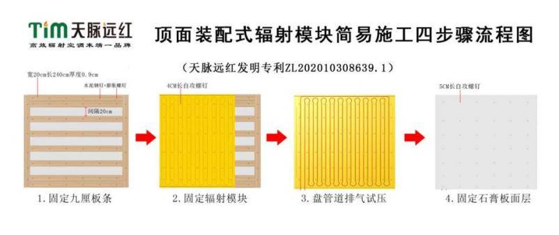 10.模块化施工高效无隐患:采用装配式干法施工,顶面用九厘板自攻螺钉固定辐射板工艺,地面采用简易施工三步骤工艺,效率高且无装修配合隐患。