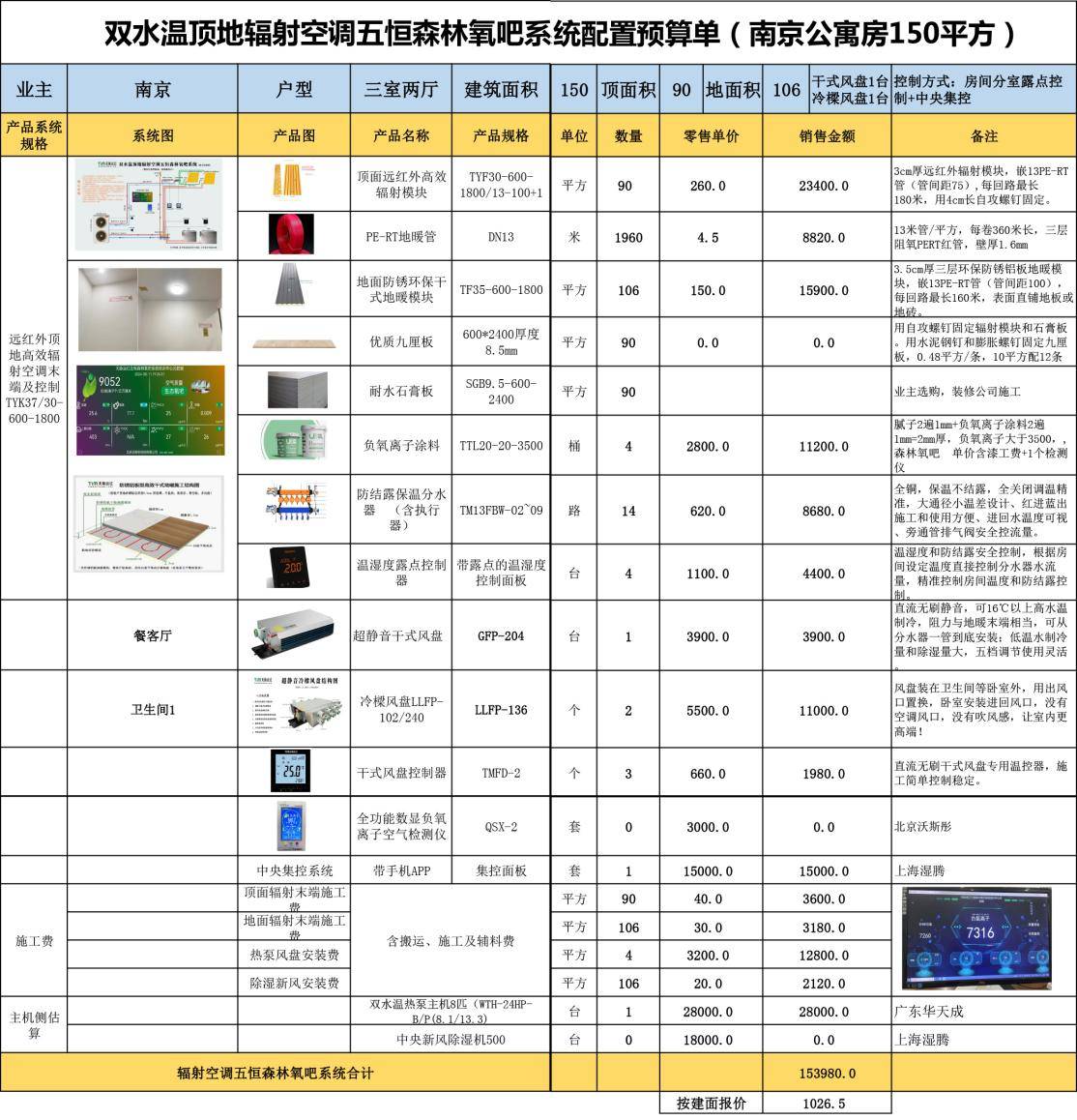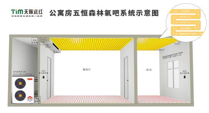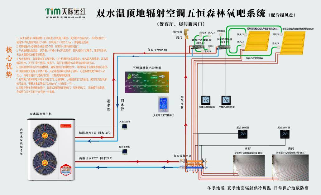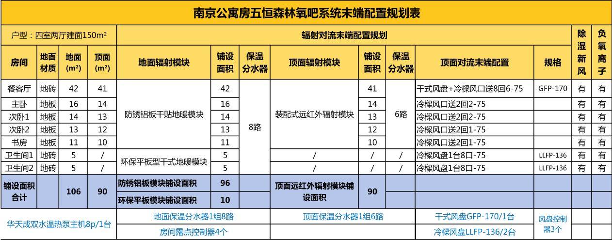 双水温热泵主机、顶地高效辐射末端、冷樑风盘或中央新风除湿机、中央控制及房间温湿度控制器,客厅增加1台干式风盘、一年四季恒温、恒湿、恒氧、恒静、恒洁,夏季辐射供冷量不低于60%,开门窗不结露,全屋顶墙采用负氧离子健康涂料,负氧离子浓度不低于5000个/cm3,可长期消除甲醛和异味,即公寓房用五恒森林氧吧系统。