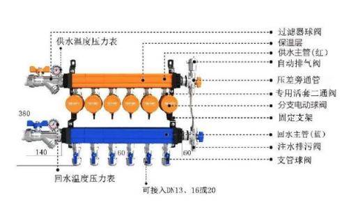 顶面采用6路、地面采用8路保温分水器(含2卫),顶面保温分水器可安装在卫生间吊顶里,或地柜里增加1根排气立管。地面保温分水器安装在厨房地柜里。保温分水器采用全铜保温加工并集成旋转式电动球阀,配置过滤器,进回水压力表、压差旁通管尾件,具有防结露控制和安装维修方便等优点。