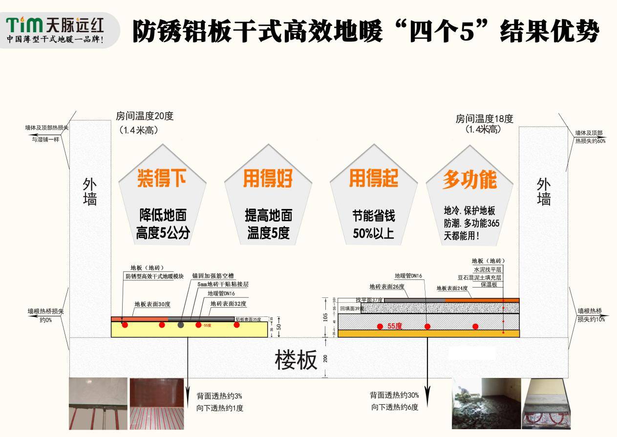4、节能使用费差异:实测铝板干式地暖背面透热温度比湿式地暖低3℃左右。