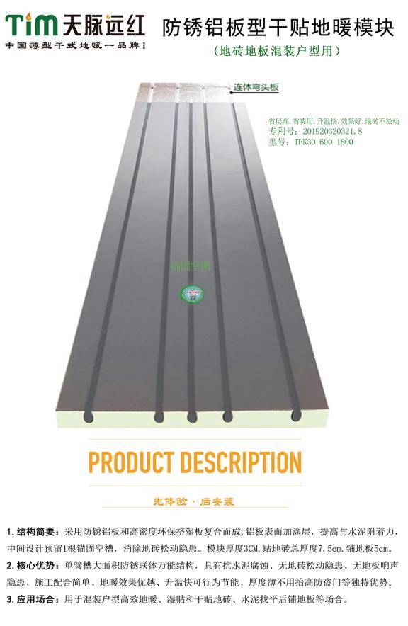 采用防锈合金铝板和高密度环保挤塑板沟槽复合而成,模块厚度3cm,采用大面积.单管槽.万能盘管结构设计,抗压强度25吨/㎡,防锈合金铝板抗水泥腐蚀,表面增加氟碳涂层,提高与水泥附着力和粘接强度,模块中间预留1根锚固空槽,让水泥下沉到空槽底部1.8cm,形成地面板樑牢固结构,表面可湿贴、薄贴或干贴地砖,总成厚度5-7cm,或表面自流平后铺地板,原地面不需要找平,简单整平即可。全铝板均热+薄水泥蓄热,标况供热量高达146W,比普通湿式地暖提高60%。抗水泥腐蚀、地暖效果好、施工简便、无地砖松动和地板响声.霉变等隐患、升温快可即开即用、行为节能一半费用!尤其适用于表面贴地砖或混装户型的高效地暖.两联供及地面调温五恒系统等场合。