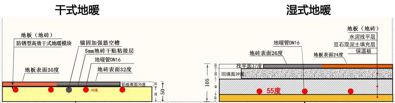 湿式地暖需要豆石水泥回填,而铝板干式地暖无需水泥回填。湿式地暖厚度为10.5cm(2cm保温板+4cm水泥回填+3.5cm水泥砂浆+1cm地砖);防锈铝板干式地暖湿贴地砖厚度为7.5cm(3cm干式模块+3.5cm水泥砂浆+1cm地砖);防锈铝板干式地暖干贴地砖厚度为5cm(3cm干贴模块+1cm瓷砖胶泥+1cm地砖)。