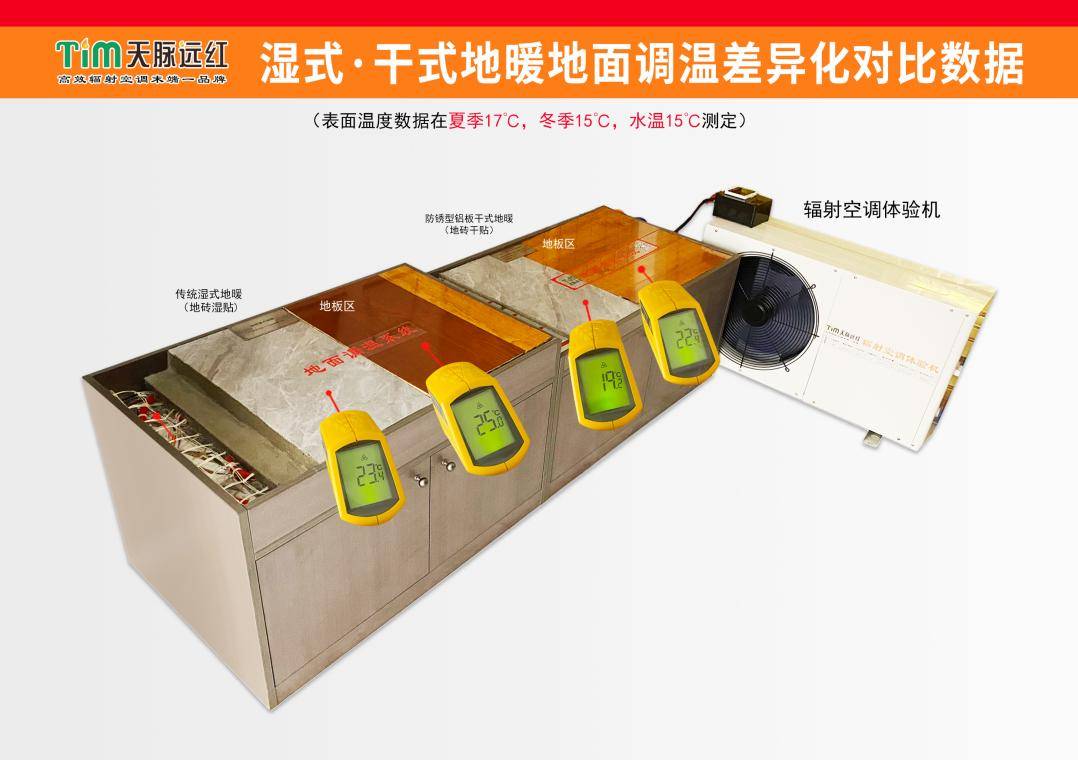 2、测到差异:通过测温器实测数据对比不同地暖表面温度差异。铝板干式地暖比湿式地暖表面温度平均提高5℃,地砖区比地板区提高约2℃。