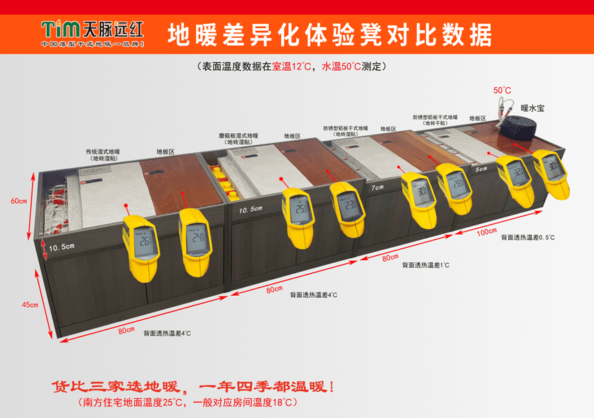 3、摸到差异:地板对地板、地砖对地砖用手摸到表面温度明显差异,背面对背面摸透热温度差异,从而真实感受不同地暖的效果差异和背面透热的节能差异。