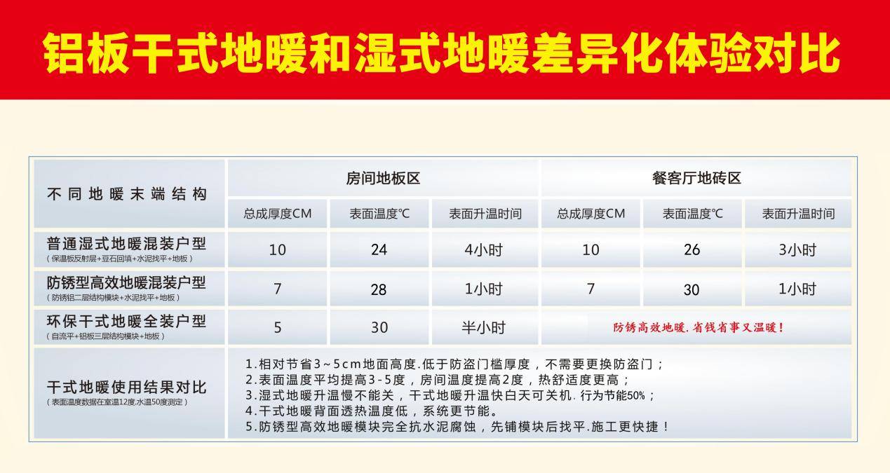 ①保温节能差异明显:湿式地暖用水泥回填、保温厚度薄.面层热阻大,导致热量向下传递多,地面保温性能较差,按照国家地暖标准JGJ142-2012中第56页数据表,湿式地暖向下传热损失平均30%;铝板干式地暖保温厚面层热阻小,背面透热量相对较少,实测约5%,两者保温节能相差25%,即开相同时间,铝板干式地暖比普通湿式地暖相对节省25%费用。