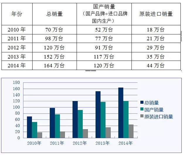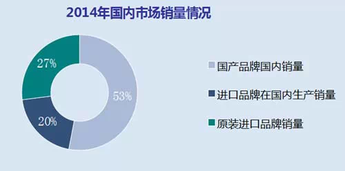 据统计,2014年中国市场燃气采暖热水炉总销量为164万台。其中国产品牌国内销量为87万台,占全年总销量的53%;进口品牌在国内生产销量为33万台,占全年总销量的20%;原装进口品牌销量为44万台,占全年总销量的27%。