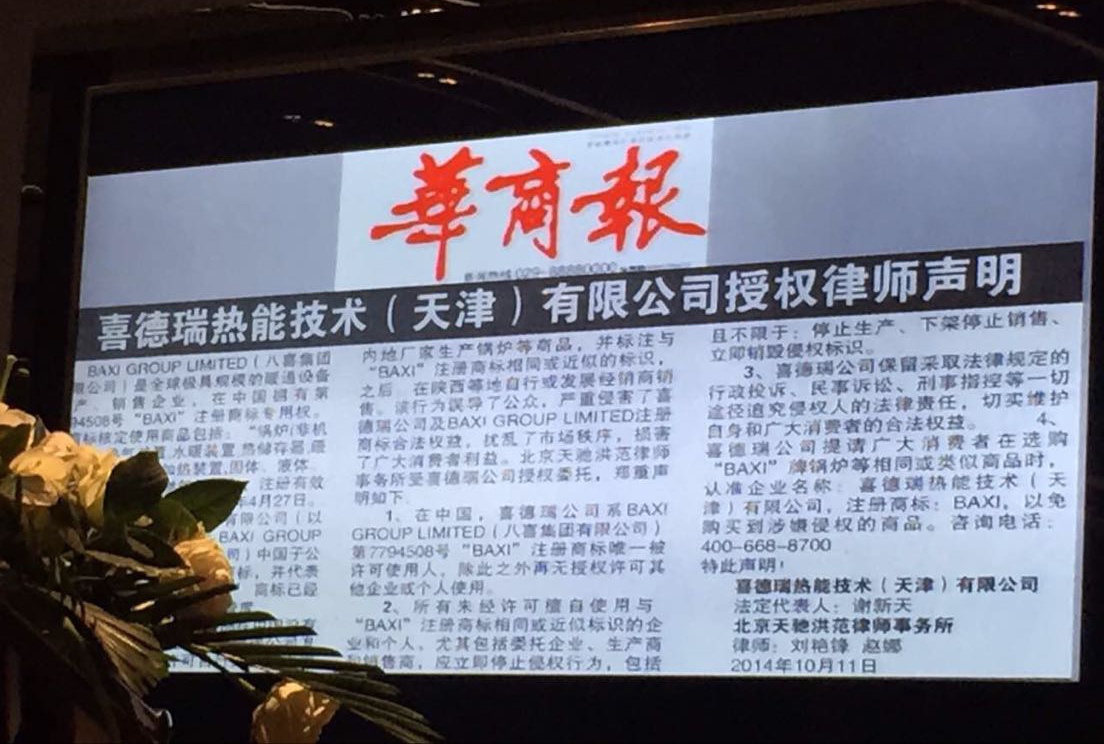 谢新天先生表示,英国百年品牌BAXI(八喜)是欧洲最大的壁挂炉生产商之一,进入中国市场已有15年,凭借国际品质的产品质量及英伦管家式的服务,已经得到了中国用户的认可,在国内有一定的知名度和美誉度。如今,有企业利用BAXI(八喜)品牌力,生产并销售仿冒“BAXI”品牌的产品,是对喜德瑞公司合法权利及合作商利益的严重侵犯,也是混淆消费者视听的行为。
