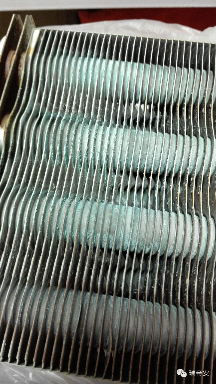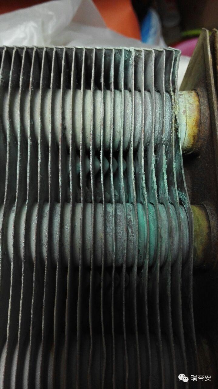 刚才说的主热交换器的清洗是内部的。其实外部也需要好好清理的。我们国家12T天然气含硫量比较高,有的含碳7、碳8,燃烧产物会吸附在主热交换器上,噪音大,换热效果不好都是原因。上面图片算是非常干净的了,办公室没有烧的非常差的。